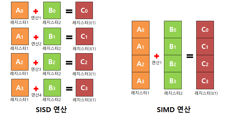 SISD: 하나의 명령어로 여러 데이터 동시 처리.