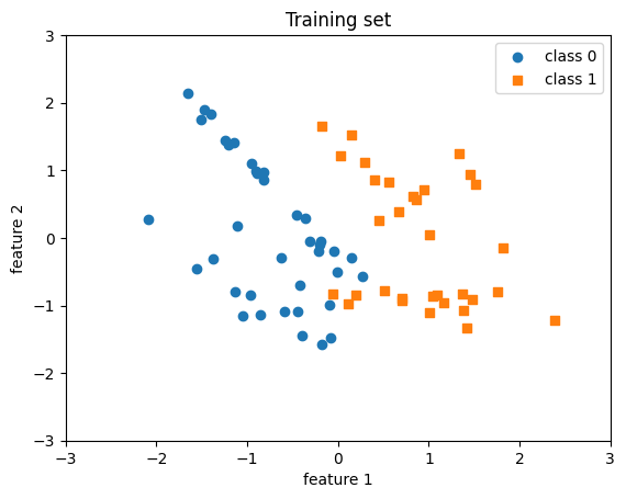 plt.scatter(X_train[y_train==0, 0], X_train[y_train==0, 1], label='class 0', marker='o') plt.scatter(X_train[y_train==1, 0], X_train[y_train==1, 1], label='class 1', marker='s') plt.title('Training set') plt.xlabel('feature 1') plt.ylabel('feature 2') plt.xlim([-3, 3]) plt.ylim([-3, 3]) plt.legend() plt.show()원본 링크