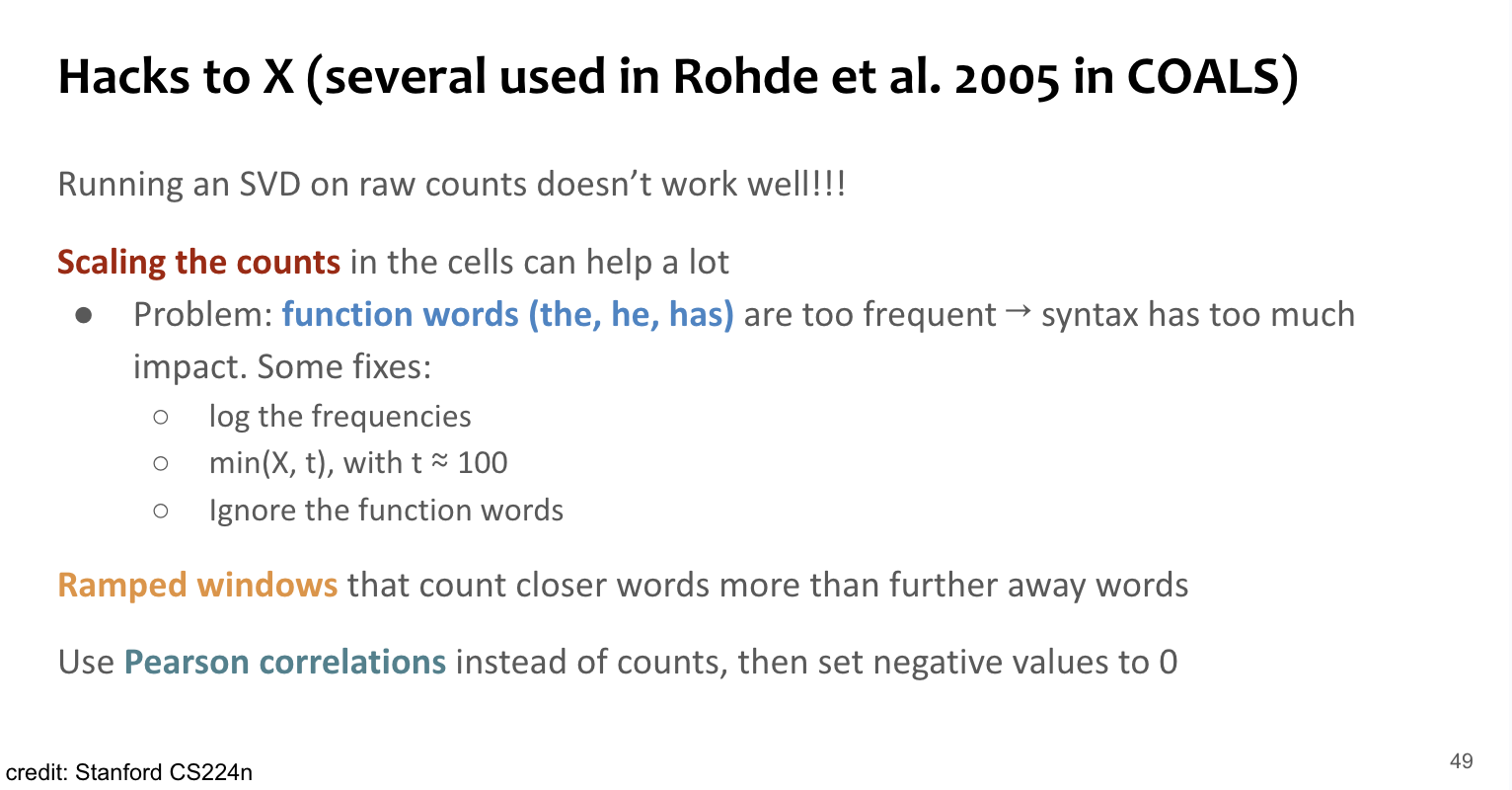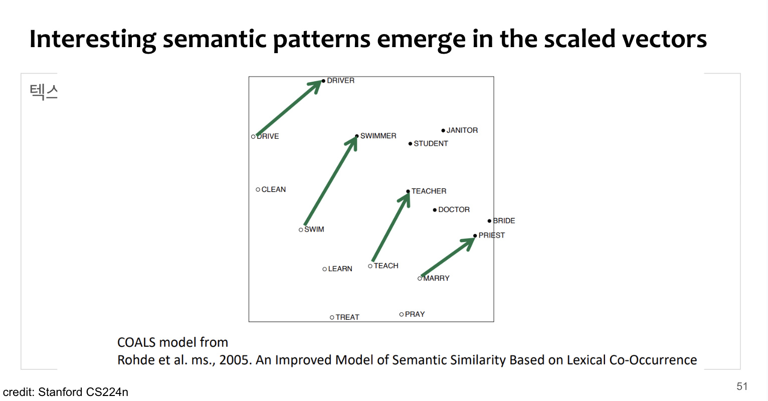 • Word2Vec 같이 iterative하게 구한 값들 말고, 예를 들어 전체 corpus에서 단어 빈도 등을 사용할 수 있지 않냐.(더 traditional 한 approach)