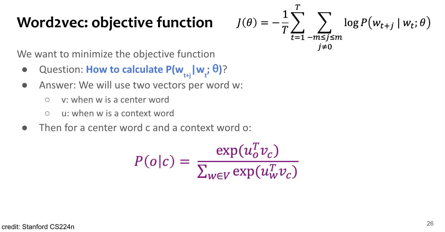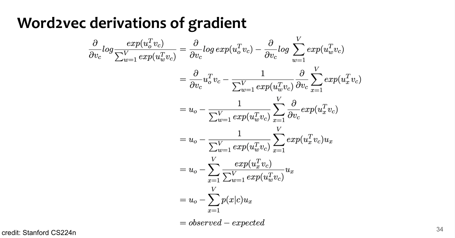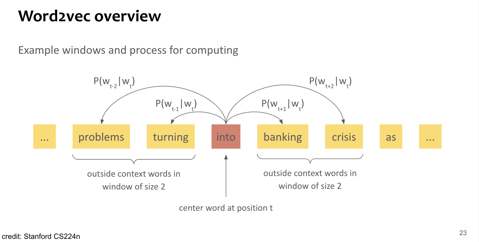 • 한 word에 대해서도 center로 사용될 때와 context로 사용될 때 다른 vector representation을 가진게 학습을 진행함.