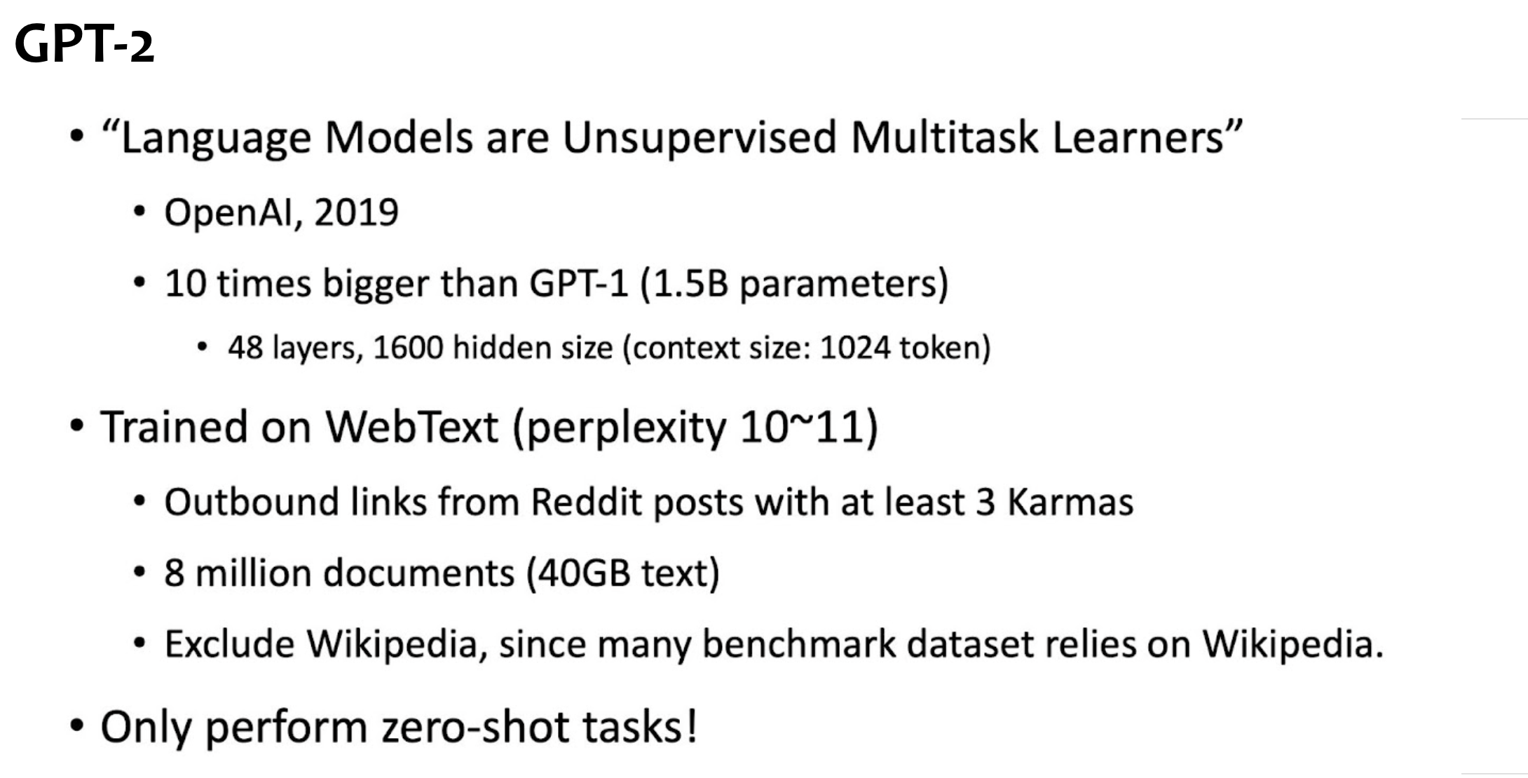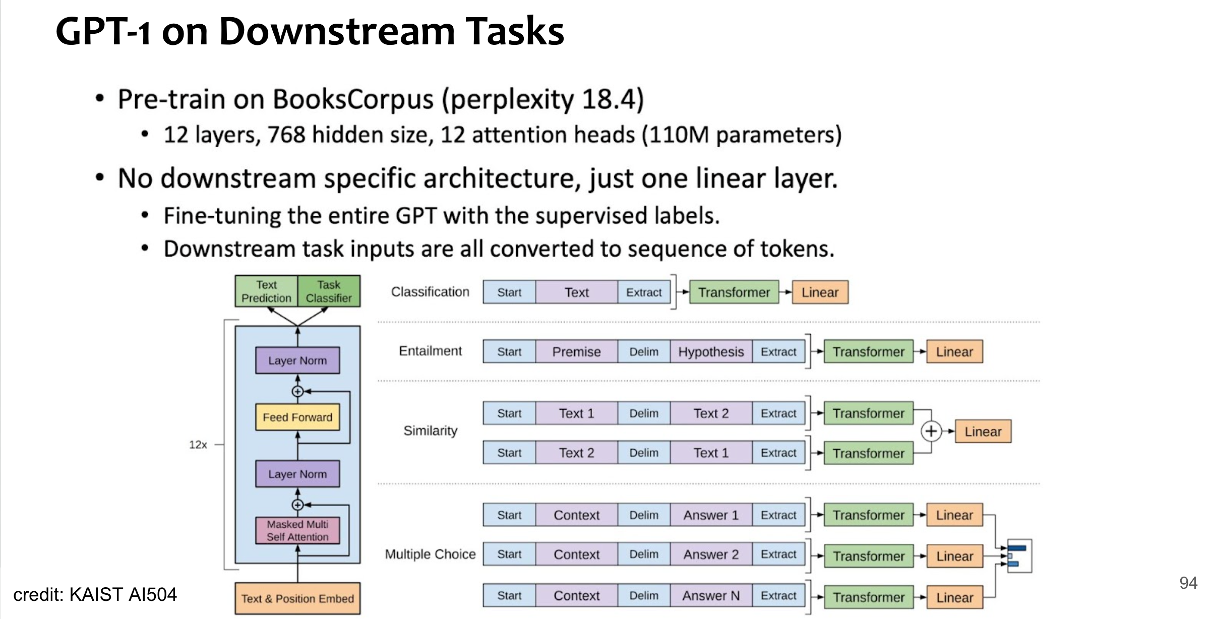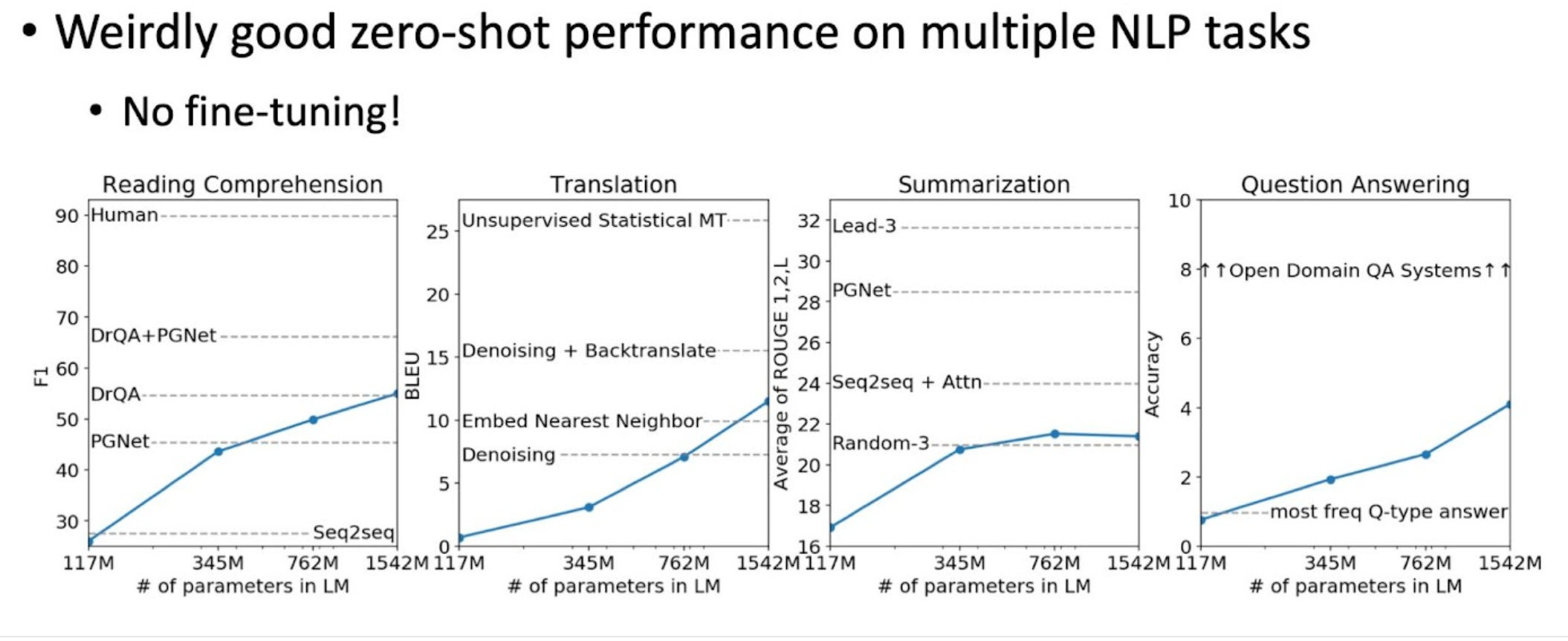 - 워낙 방대하게 학습시키다 보니, 요즘은 emergent behavior라 해서, 별도의 downstream-task를 위한 fine-tune 없이도 대부분의 task에서 우수한 성능을 보여주기도 한다.