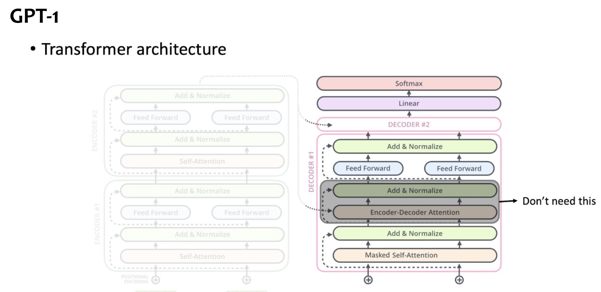 encoder 부분은 사용하지 않으니, decoder 부분의 encoder-decoder attention 부분이 동작하는 block은 GPT1에서 사용되지 않음.NOTE