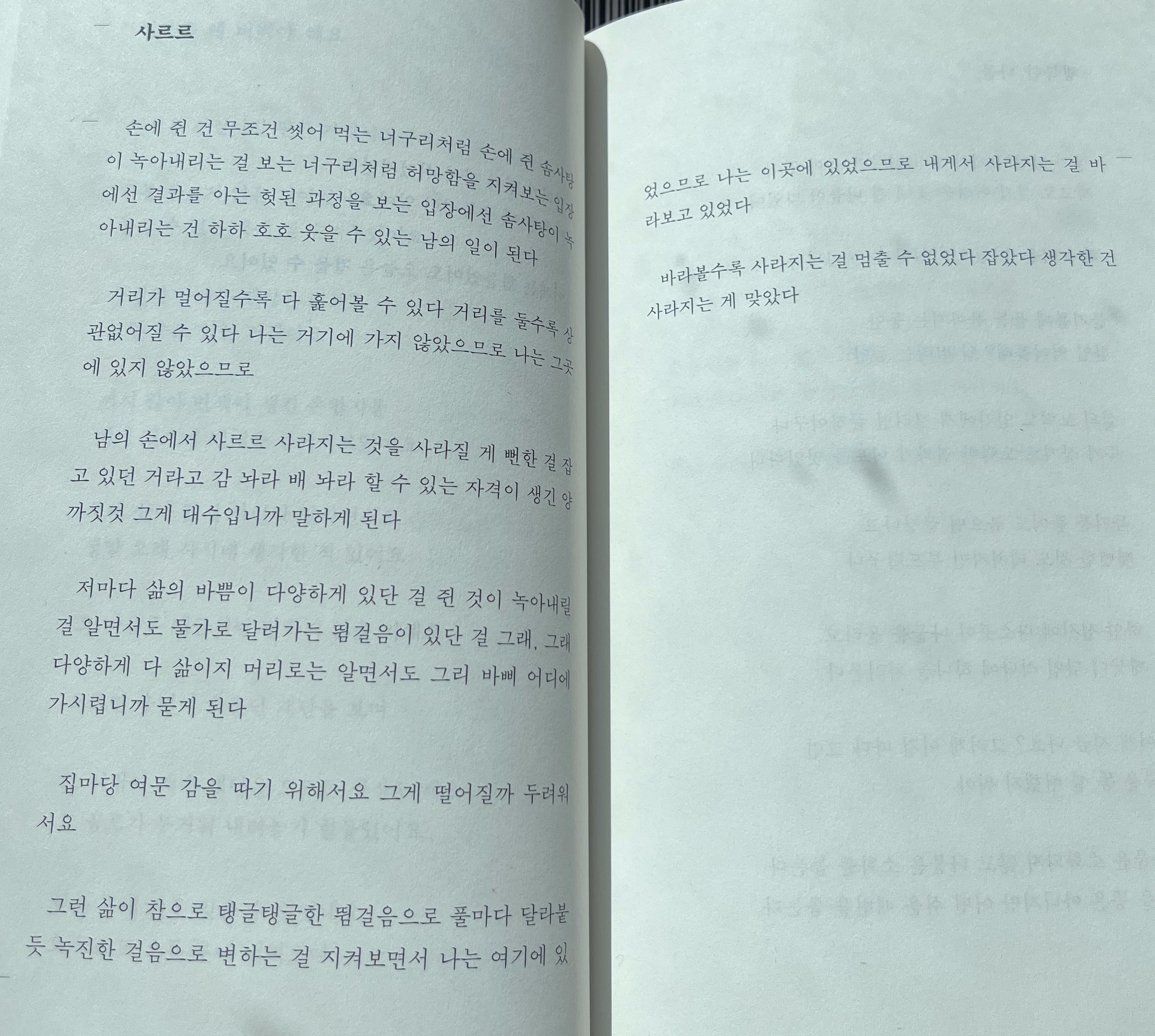 사르르 라는 제목에서도 볼 수 있듯이 ‘사라짐’과 그를 대하는 태도를 다루는 게 주인 시 같다.