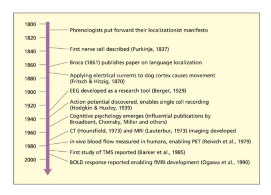 A timeline for the development of methods and findings relevant to cognitive neuroscience, from phrenology to present day.