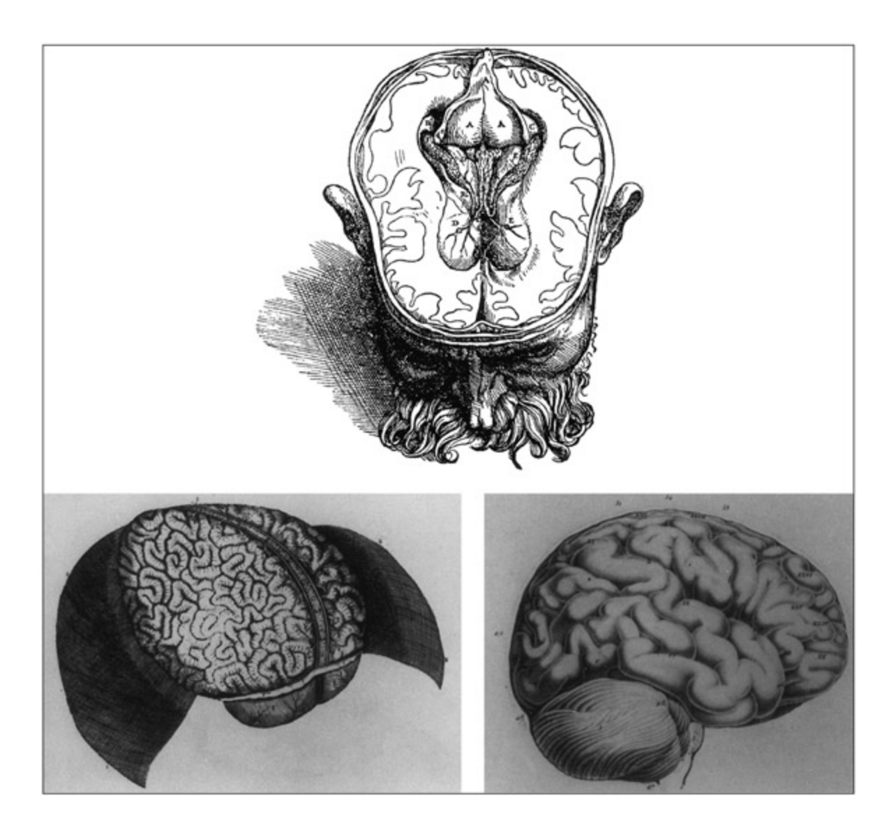 Drawings of the brain from Vesalius (1543) (top), de Viessens (1685) (boom le) and Gall and Spurzheim (1810) (boom right). Note how the earlier two drawings emphasized the ventricles and/or misrepresented the cortical surface.