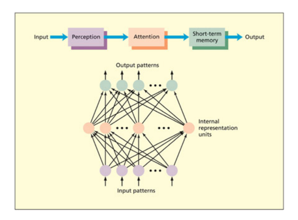 박스-화살표 모델과 연결주의 모델의 비교 예시이다. 박스-화살표 모델은 인지 과정을 순차적 단계(지각 → 주의 → 단기기억 → 장기기억)로 도식화하며, 연결주의 모델은 상호 연결된 노드들의 네트워크를 통해 병렬적 정보 처리를 표현한다. 두 모델 모두 뇌 구조를 직접 참조하지 않고 인지 과정을 설명하는 방식이다.