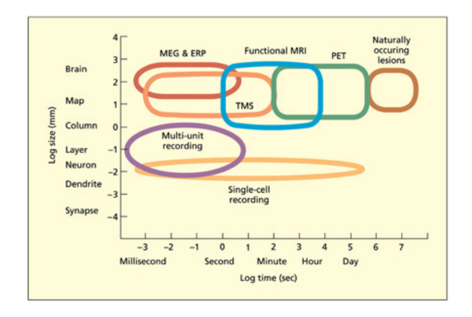 The methods of cognitive neuroscience can be categorized according to their spatial and temporal resolution.