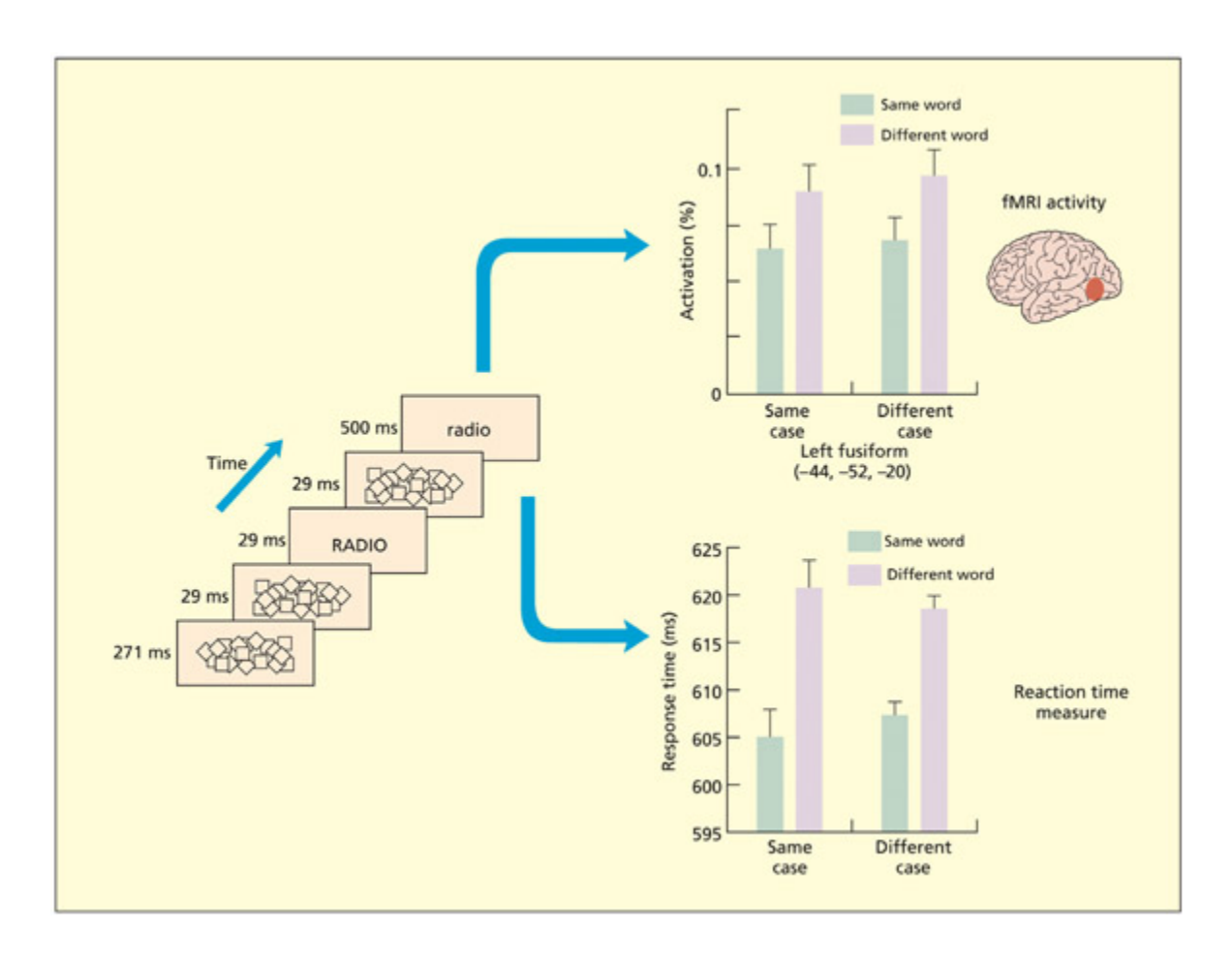 Both reaction times and fMRI activation in the le fusiform region demonstrate more efficient processing of words if they are preceded by subliminal presentation of the same word, irrespective of case.