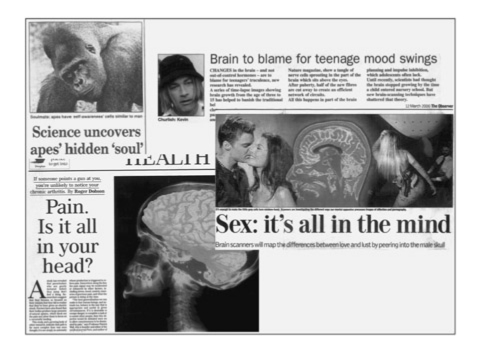 e media loves to simplify the findings of cognitive neuroscience. Many newspaper stories appear to regard it as counterintuitive that sex, pain and mood would be products of the brain. Sunday Times, 21 November 1999; Metro, 5 January 2001; The Observer, 12 Mar 2000; The Independent, 27 May 1999.