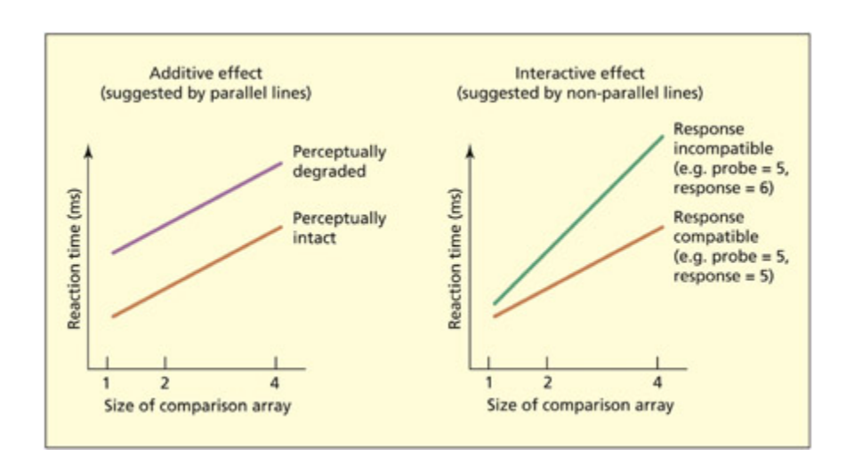 He further postulated that ea of these stages could be independently influenced by different factors affecting the task. For instance, the encoding stage may be affected by the perceptibility of the probe digit (e.g. presenting it on a paerned baground). e comparison stage may be affected by the number of items in the array (the more items in the array, the slower the task). He reasoned that, if different factors affect different stages of processing, then the effects should have additive effects on the overall reaction time, whereas if they affect the same processing stage, they should have interactive effects. e strength of this method is that one could then take an unknown factor (e.g. sleep deprivation, Parkinson’s disease, reading ability) and determine whether this has an interactive effect on stimulus perceptibility (implying that the new factor affects perceptual encoding) or whether it has an interactive effect with the number of items in the array (implying the new factor affects the comparison stage) or both (implying the new factor has effects at multiple levels).