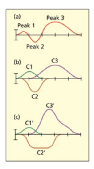 Graph (a) shows an observed ERP waveform and graphs (b) and (c) show two different sets of hidden components that could have given rise to it. is illustrates the point that there is not a one-to-one mapping between ERP components and the activity of underlying cognitive/neural components. From Lu, 2005. © 2004 Massauses Institute of Tenology by permission of the MIT Press.