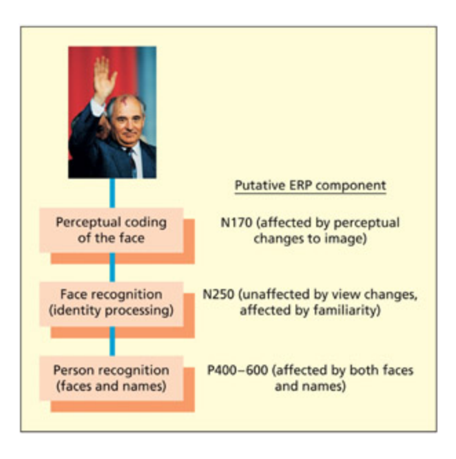N170은 얼굴 구조 인식과 연관된 ERP 성분으로, 인간 및 동물 얼굴에서 관찰되지만 다른 물체에서는 나타나지 않는다. 연관성 프라이밍(associative priming)은 ERP 분석 결과 300ms 이후에 영향을 미쳐 지각 후 처리 단계와 관련되며, 이는 Sternberg의 이산 단계 가정이 항상 유효하지 않음을 시사한다.