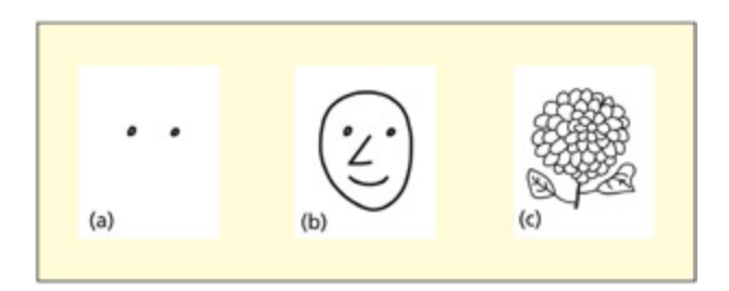 Two horizontally spaced symbols (the dots in a) do not elicit an N170 unless they have previously been presented in the context of a face (b). e participant’s task was merely to count flowers (e.g. c), and so both the faces and “eyes” were irrelevant to the task.