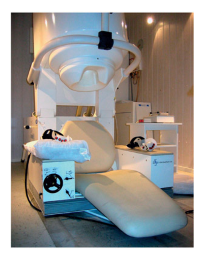 MEG 스캐너의 외관을 보여주는 사진이다. 이 장비는 SQUID 센서를 사용하여 뇌의 전기적 활동이 생성하는 미세한 자기장을 측정하며, 액체 헬륨으로 냉각되는 초전도 장치와 자기장 차폐실 내에서 운용된다.