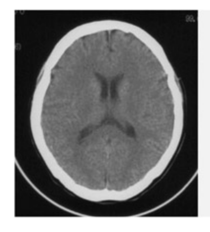 컴퓨터 단층 촬영(CT) 뇌 스캔 이미지이다. X선 흡수량에 따라 뼈(두개골)는 흰색, 뇌척수액(뇌실)은 검은색, 뇌 조직은 회색으로 나타난다. CT는 종양이나 출혈 진단에 주로 사용되지만, 회백질과 백질을 구분하지 못하는 한계가 있다.