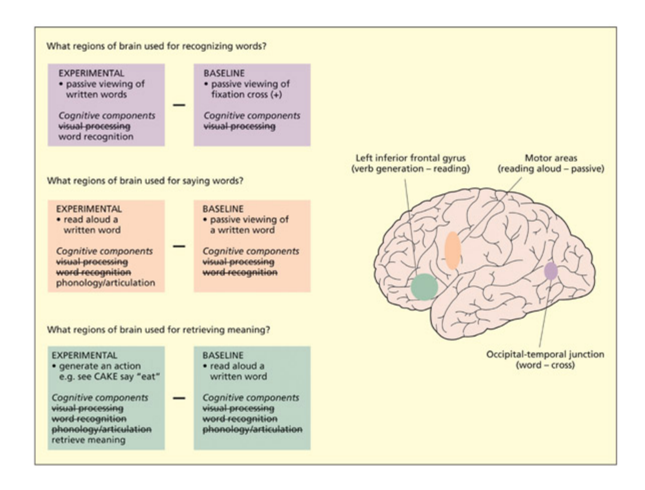 - What is meant by the method of “cognitive subtraction” in functional imaging resear? What problems does this method face?