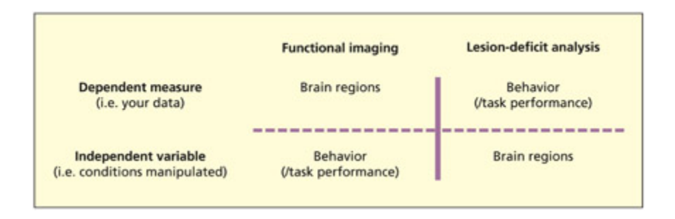 기능적 뇌 영상과 손상-결핍 분석(또는 TMS)의 논리적 차이를 비교한 다이어그램이다. 손상 연구에서는 뇌 손상 위치를 독립 변수로, 행동 변화를 종속 변수로 설정하여 인과 관계를 추론하는 반면, 기능적 영상에서는 과제를 조작하여 뇌 활성화 변화를 관찰한다. 두 방법론은 상호 보완적이며 하나가 다른 하나를 대체할 수 없음을 시각적으로 설명한다.