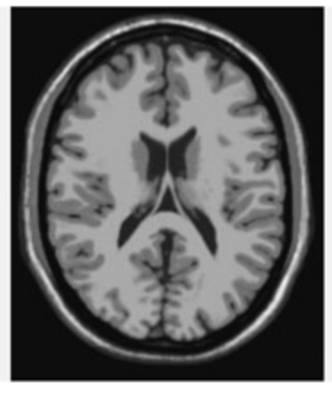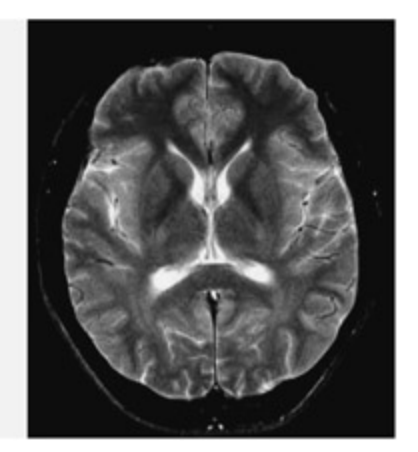 T2-가중 MRI 뇌 스캔 이미지이다. T1-가중 영상과 달리 조직의 T2 이완 시간 차이를 반영하며, 뇌척수액이 밝게 나타나는 특징이 있다. T2* 성분은 탈산소화 헤모글로빈에 민감하여 fMRI의 BOLD 신호 측정의 기초가 된다.