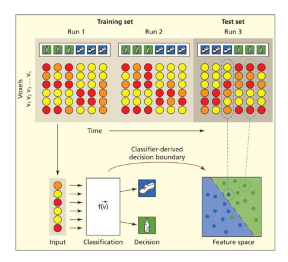 In MVPA experimental designs, participants are given certain tasks or stimuli (in this example seeing boles or shoes) and a mathematical algorithm (a “classifier”) trains itself to optimally discriminate between them based on the paern of activity in the voxels (note: the actual spatial arrangement of voxels isn’t crucial). In the next phase (testing), the participant is then given more tasks or stimuli (e.g. new images of shoes) and the algorithm must classify them. In this phase the participant’s mind/brain is effectively being “read.”