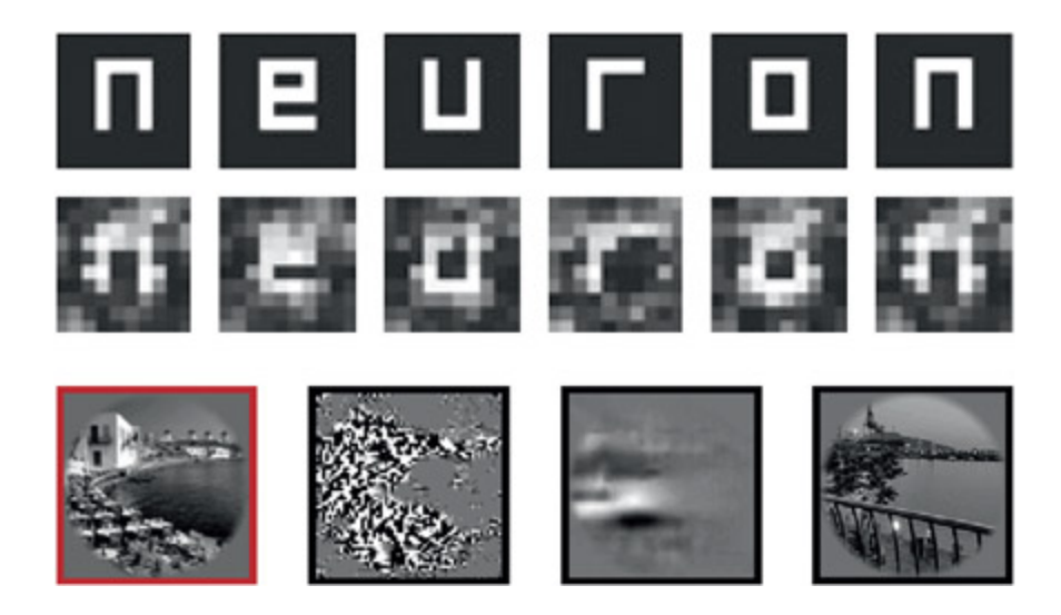 Can activity in the brain be used to reconstruct what image is being seen? In the top example, leers displayed in a 10 · 10 grid to the participants can clearly be read out from the paern of brain activity. In the boom example, the target image is shown on the le (red outline) and, to the right, are shown three aempts at image reconstruction from the paern of activity (bla outline). e first reconstruction uses an algorithm based on detecting local contrast. e second reconstruction uses the global (blurred) image aracteristics. e final aempt involves finding a best mat from a database of 6 million images (not including the target image).