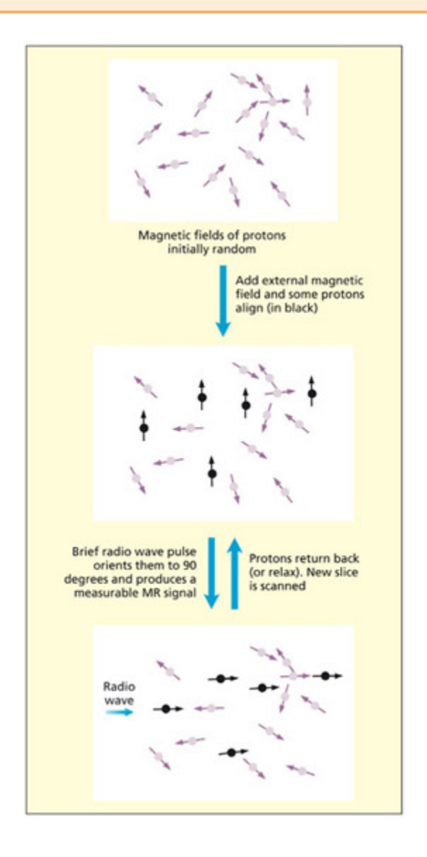 - 이완(Relaxation)과 신호 검출 — 양성자들이 회전된 상태에서 다시 원래 정렬로 돌아가면서(세차 운동, precession) 검출 가능한 자기장 변화를 만들어내고, 이것이 MR 신호가 된다