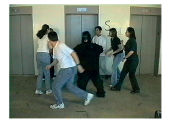 농구 경기에서 패스 횟수를 세는 과제에 집중하는 동안 고릴라 복장을 한 사람이 등장하는 장면을 보여주는 실험 장면이다. 이 실험은 부주의 맹시(inattentional blindness)를 입증하며, 주의가 특정 과제에 집중될 때 눈에 띄는 자극도 인지하지 못할 수 있음을 보여준다. Simons와 Chabris(1999)의 고전적 실험으로, 참가자의 약 50%가 고릴라를 인지하지 못했다.