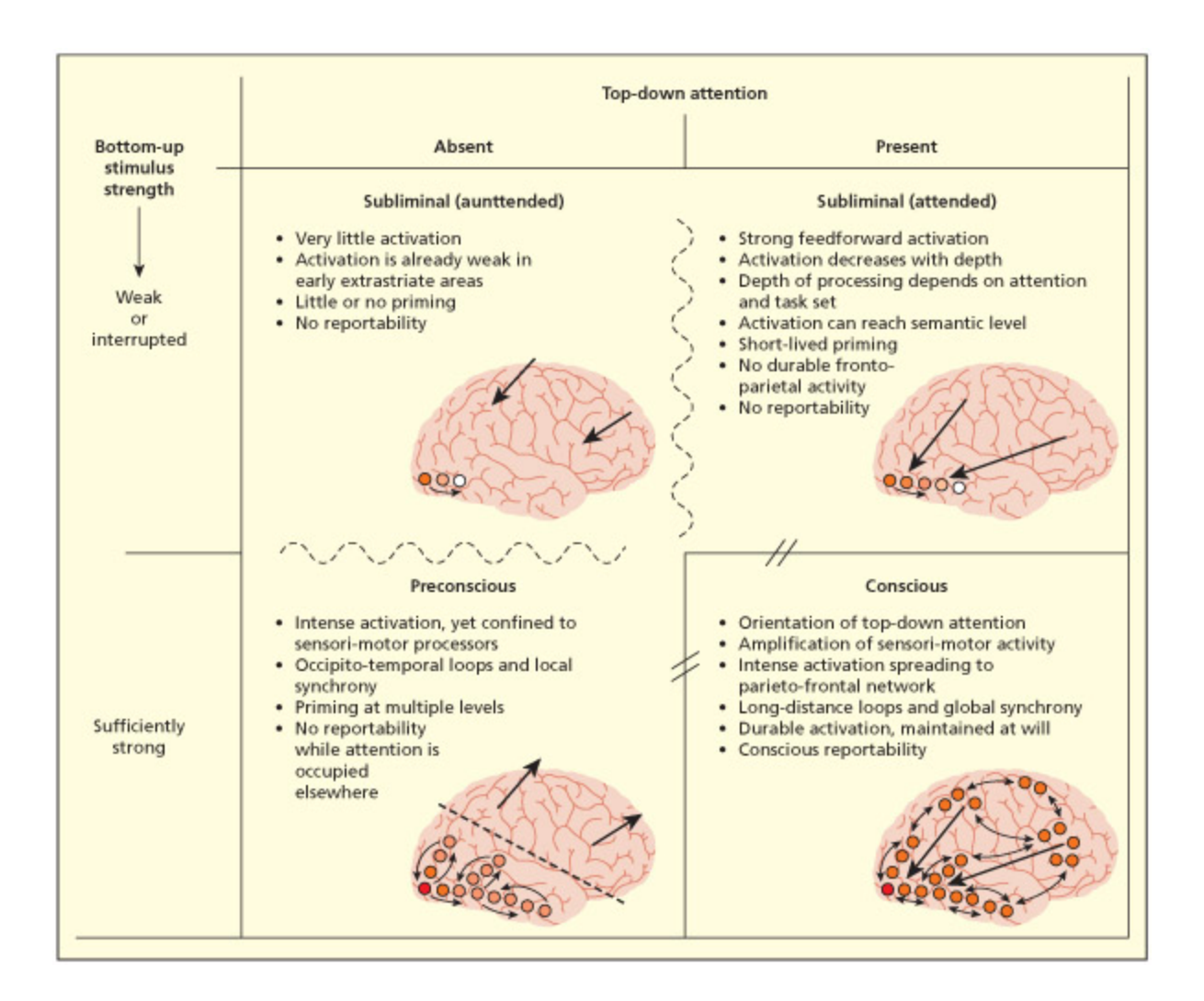 이 섹션에서는 주의(attention)가 정보 선택을 통해 감각 과부하를 방지하는 동적인 시스템으로, 상향식(top-down, 작업 관련)과 하향식(bottom-up, 감각 기반)의 상호작용을 통해 여러 수준(인식, 의미, 반응 기반)에서 선택이 이루어진다는 핵심 개념을 정리한다. 두정엽(parietal lobes)은 감각 기반의 공간 맵(예: 망막 중심 좌표)을 자기 중심(egocentric) 공간 맵으로 변환하며, 이 맵은 하향식 또는 상향식 제약에 따라 주요 특징(salient features)을 강조하는 희소 코드로 구성된다. 하향식 외부 자극(exogenous cues)에 따른 주의 지향은 시선 움직임 준비와 관련된 메커니즘과 연결되며, 집중된 자극(attended)은 해당 자극을 인식하는 뇌 영역(예: 시각 하부 유도 경로)과 전두-두정엽 네트워크(frontoparietal network)에서 더 높은 활성화를 유발한다. 이 네트워크는 일반적으로 의식적 인식(conscious awareness)과 관련된다. 두정엽 내부의 다양한 메커니즘(예: 후두두정엽 vs. 두정엽, 좌우 반구 차이)이 존재하지만, 이들이 어떻게 상호작용하는지는 명확하지 않다. 또한, 무시증(neglect) 연구는 공간이 뇌 내 여러 수준에서 표현됨을 입증하며, 이는 주의와 인식, 의식 간의 복잡한 관계를 반영한다.