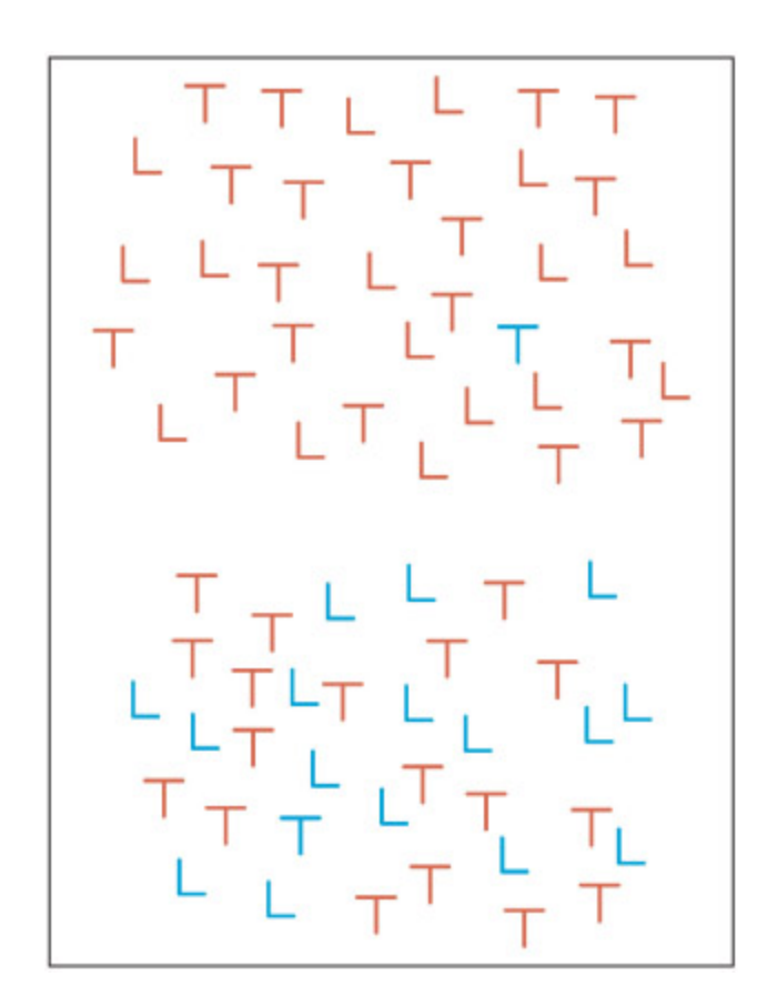 A task of detecting the presence or absence of a specified target object in an array of other distracting objects.
