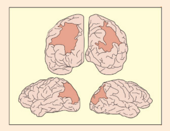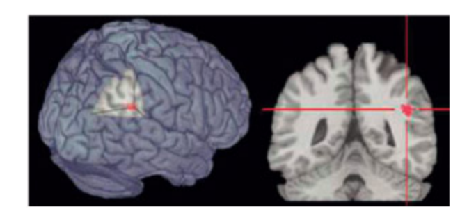 Neglect is associated with lesions to the right inferior parietal lobe. is photo shows the region of highest overlap of the lesions of 14 patients.