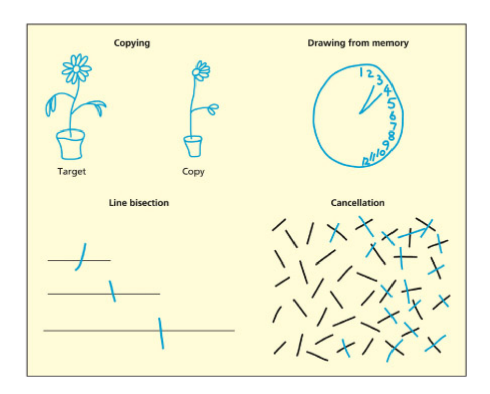 Different ways of assessing neglect include copying, drawing from memory, finding the center of a line (line bisection), and crossing out targets in an array (cancellation).