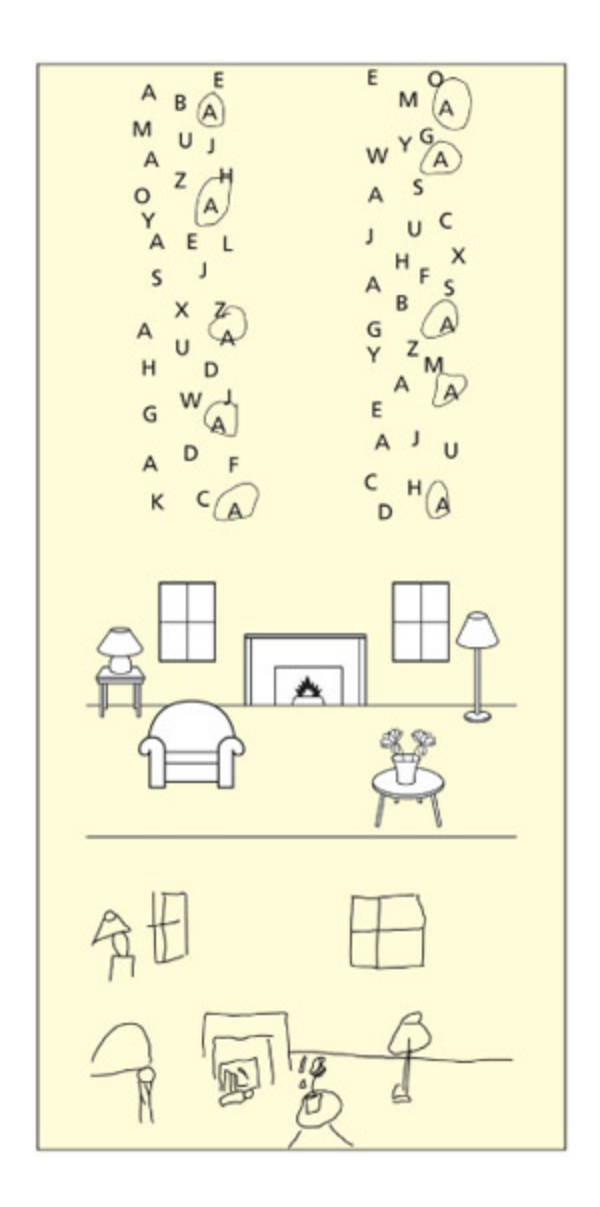 Look at the figures to the right (from Robertson, 2004). Note how the patient has aempted to draw all of the objects in the room (including those on the le) but has distorted or omied the le parts of the objects. Similarly, the patient has failed to find the As on the le side of the two columns of leers