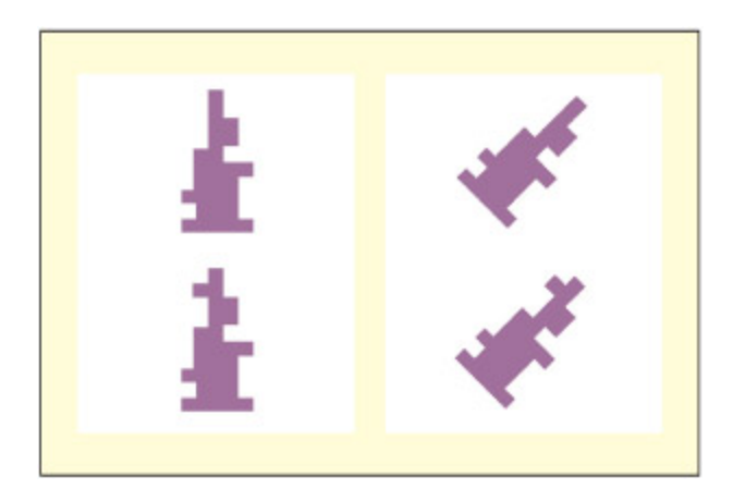 객체 기반 좌표와 환경 기반 좌표가 대립하는 실험 자극을 보여준다. Driver와 Halligan(1991)의 과제에서 두 무의미 물체의 차이가 물체의 왼쪽에 있지만 공간적으로는 오른쪽에 위치하는 기울어진 조건을 사용한다. 환자가 이 차이를 발견하지 못하는 것은 무시가 물체 중심 좌표에서 작동함을 보여준다.