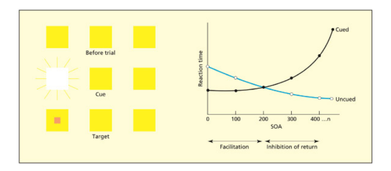 Participants initially fixate at the central box. A brief cue then appears as a brightening of one of the peripheral boxes. Aer a delay (called the “stimulus onset asynrony,” or SOA), the target then appears in the cued or uncued box. Participants are faster at detecting the target in the cued location if the target appears soon aer the cue (facilitation) but are slower if the target appears mu later (inhibition).