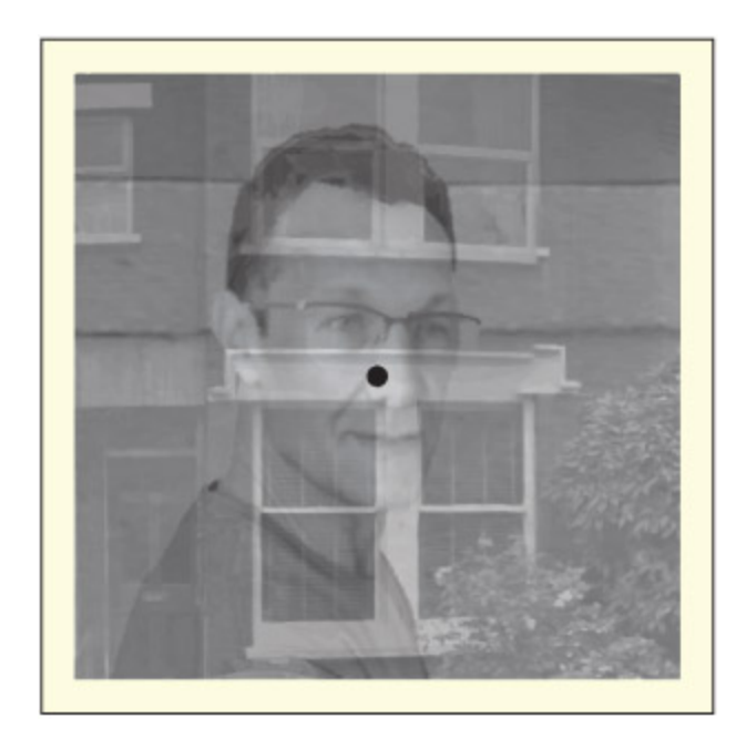 동일한 공간 위치에 투명하게 겹쳐진 얼굴과 집 이미지를 보여준다. 객체 기반 주의(object-based attention)를 설명하는 자극으로, 참가자가 어느 쪽에 주의를 집중하느냐에 따라 해당 뇌 영역(FFA 또는 PPA)의 활성화가 달라진다. Kanwisher와 Wojciulik(2000)의 연구에서 인용되었다.