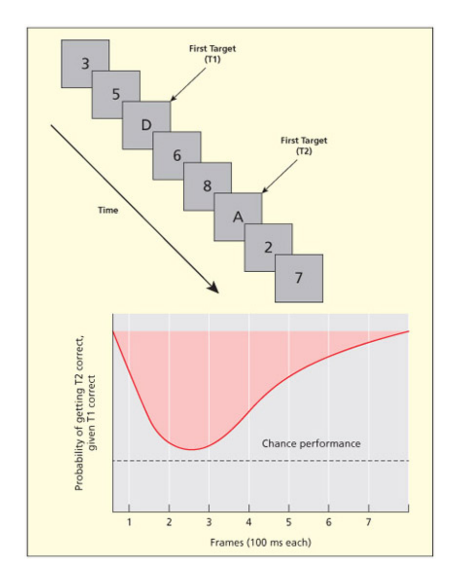- 주의 블라인드 실험에서, T1(첫 번째 타겟) 이후 2-3개 항목 내에 나타난 T2(두 번째 타겟)는 50% 이상 인지되지 못하는 것으로 보여, 주의의 시간적 한계를 실증한다.