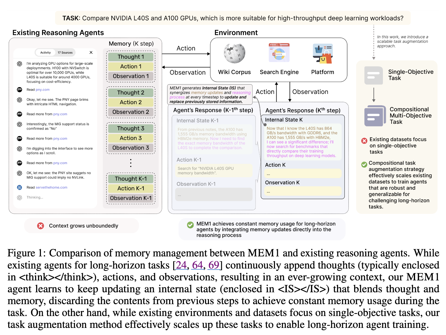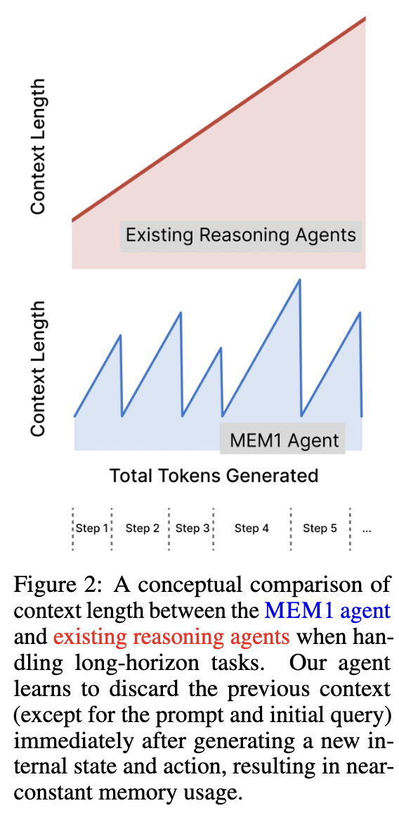 에이전트가 긴 multi-turn task에서 constant memory로 작동할 수 있도록 하는 end-to-end RL framework인 MEM1을 제안.