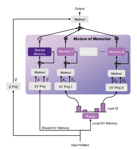 MoM은 기억의 혼합(Mixture of Memories)을 기반으로 한 모델로, 장기 의존성과 다양한 정보 유지를 위한 메커니즘을 제공합니다. 이 모델은 로터(router), 선형 순환 기억 모듈(linear recurrent memory module), 공유 기억(shared memory)을 핵심 구성 요소로 포함하며, 각각의 역할을 통해 효율적인 정보 처리를 수행합니다.