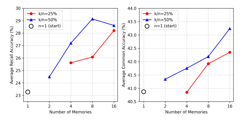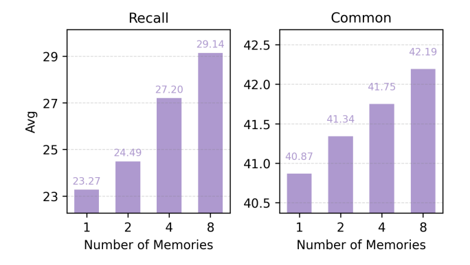 To further examine the scalability of MoM from the perspective of memory capacity, we evaluate the effect of enlarging the memory pool beyond the main settings. Specifically, we compare two activation ratios, where the number of active memories accounts for either 0.5 or 0.25 of the total memory states. In all cases, an additional shared memory is included. Starting from a single memory as the baseline, we expand the number of memories to 2, 4, 8, and 16, and report the averaged results on both recall-intensive and commonsense benchmarks. The results, shown in Fig. 8, indicate that under a fixed activation ratio, increasing the memory size consistently improves performance on both categories of tasks.