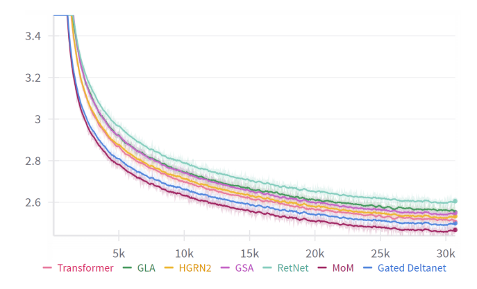 To further assess the learning efficiency of MoM, we compared the training loss curves of MoM with those of other baseline models. As depicted in Figure 7, MoM consistently maintains the lowest loss