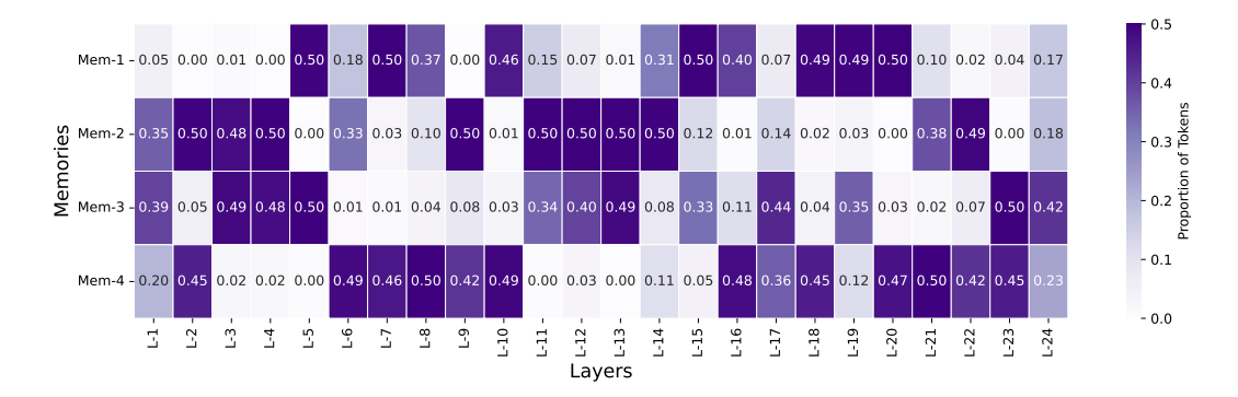 Figure 9: Memory Load Balance Analysis. Token Routing Distribution Across Layers and Memories without Aux Loss.