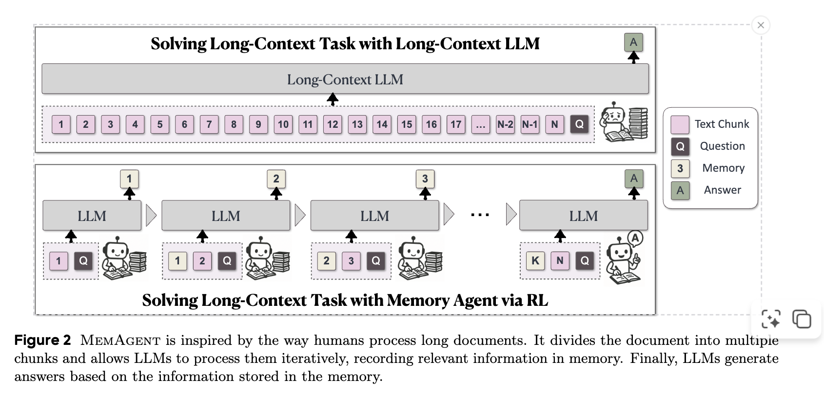 - MemAgent는 RL 기반 memory agent를 도입하여 LLM의 long-context 능력을 재구성, 긴 문서를 선형적인 복잡도로 효율적으로 처리합니다.