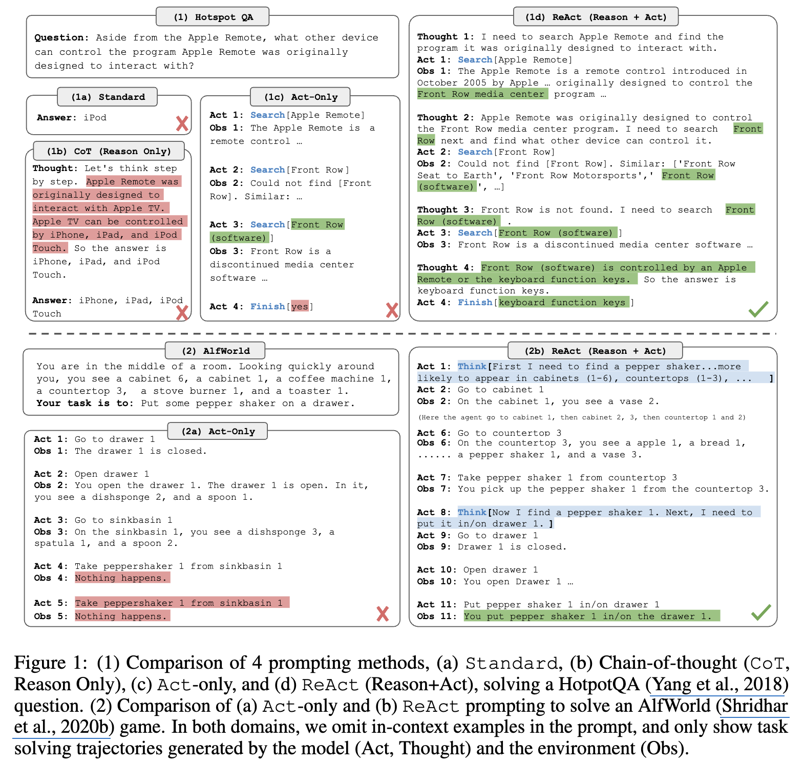 - Chain-of-Thought Prompting โ ReAct๊ฐ ๊ทน๋ณตํ๊ณ ์ ํ ๋ด๋ถ ์ถ๋ก ์ ์ฉ ์ ๊ทผ. CoT์ ReAct์ ์กฐํฉ์ด ์ต๊ณ ์ฑ๋ฅ.