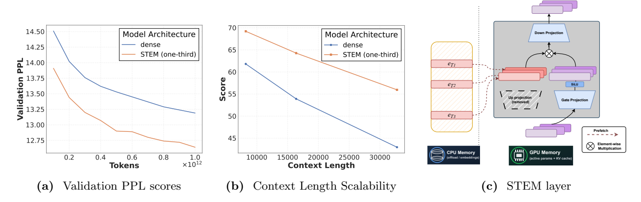 Figure 1 (a) Validation PPL vs. training tokens for 1B STEM vs. dense; (b) Needle-in-a-Haystack at 8k/16k/32k; (c) STEM layer: embedding tables offloaded to CPU and token-indexed ones are prefetched to GPU.
