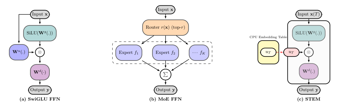 Figure 2 Schematics of (a) SwiGLU FFN, (b) MoE FFN, and (c) STEM with a single prefetched token embedding. In MoE FFN, the full FFN module is considered as one expert.