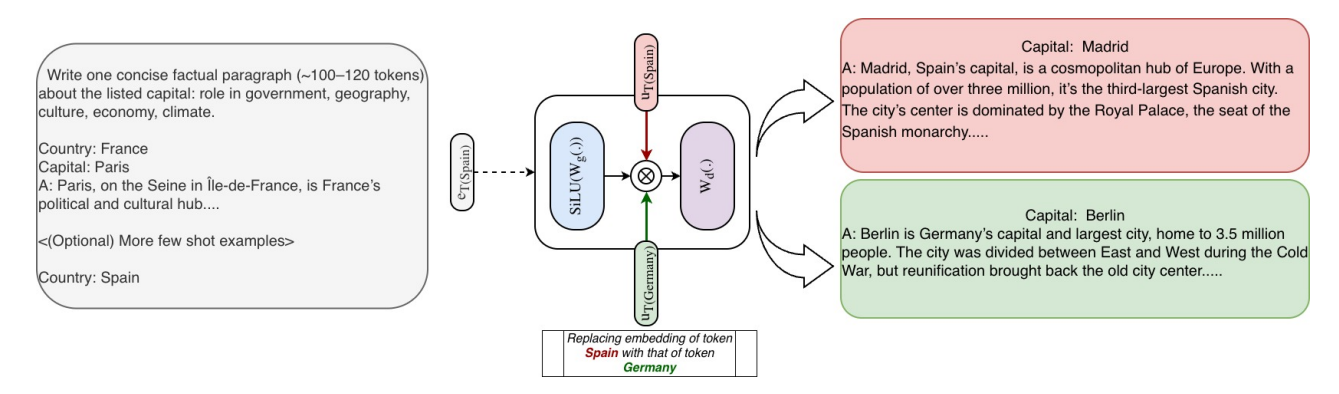 Figure 3 Knowledge injection/edit demonstration. Input text remains the same (Country: Spain), but internally the PLE used for the token is swapped from Spain to Germany, flipping the generated capital/paragraph from Madrid to Berlin.