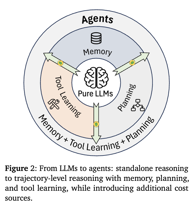 - 에이전트는 다단계 계획, 외부 도구 사용, 메모리 기반 의사결정 등의 기능을 통해 추가 비용(예: 도구, 메모리, 재시도)이 발생하며, 효율성 향상은 언어 생성뿐 아니라 도구/메모리 호출 빈도와 선택성 개선을 포함한다.
