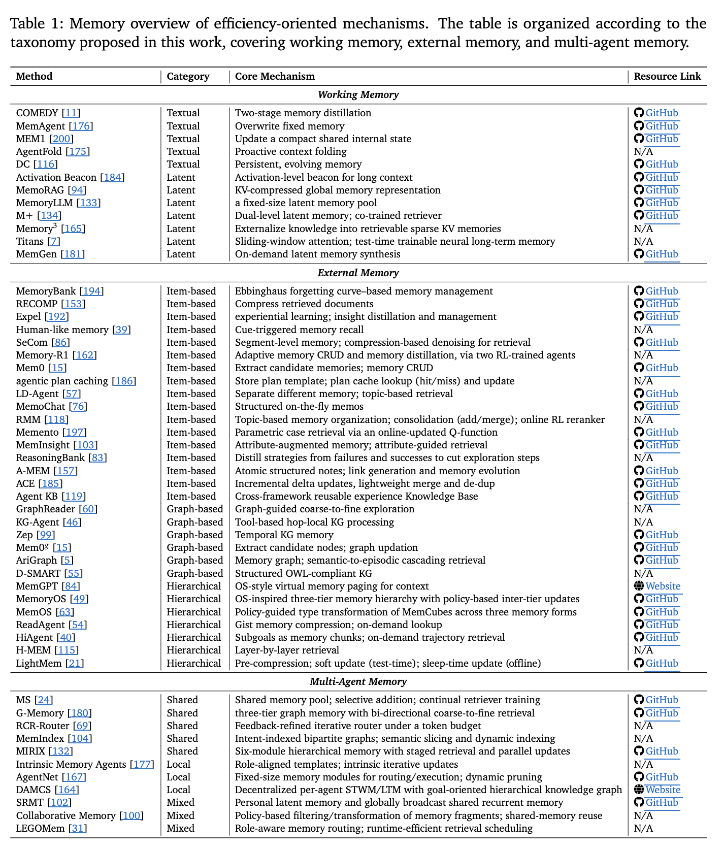 - 표 1은 작업 기반 메모리, 외부 메모리, 다중 에이전트 메모리로 분류된 효율성 중심 메커니즘을 정리한 것으로, 텍스트 기반 및 잠재 공간 기반 메모리 접근법을 포함한다.