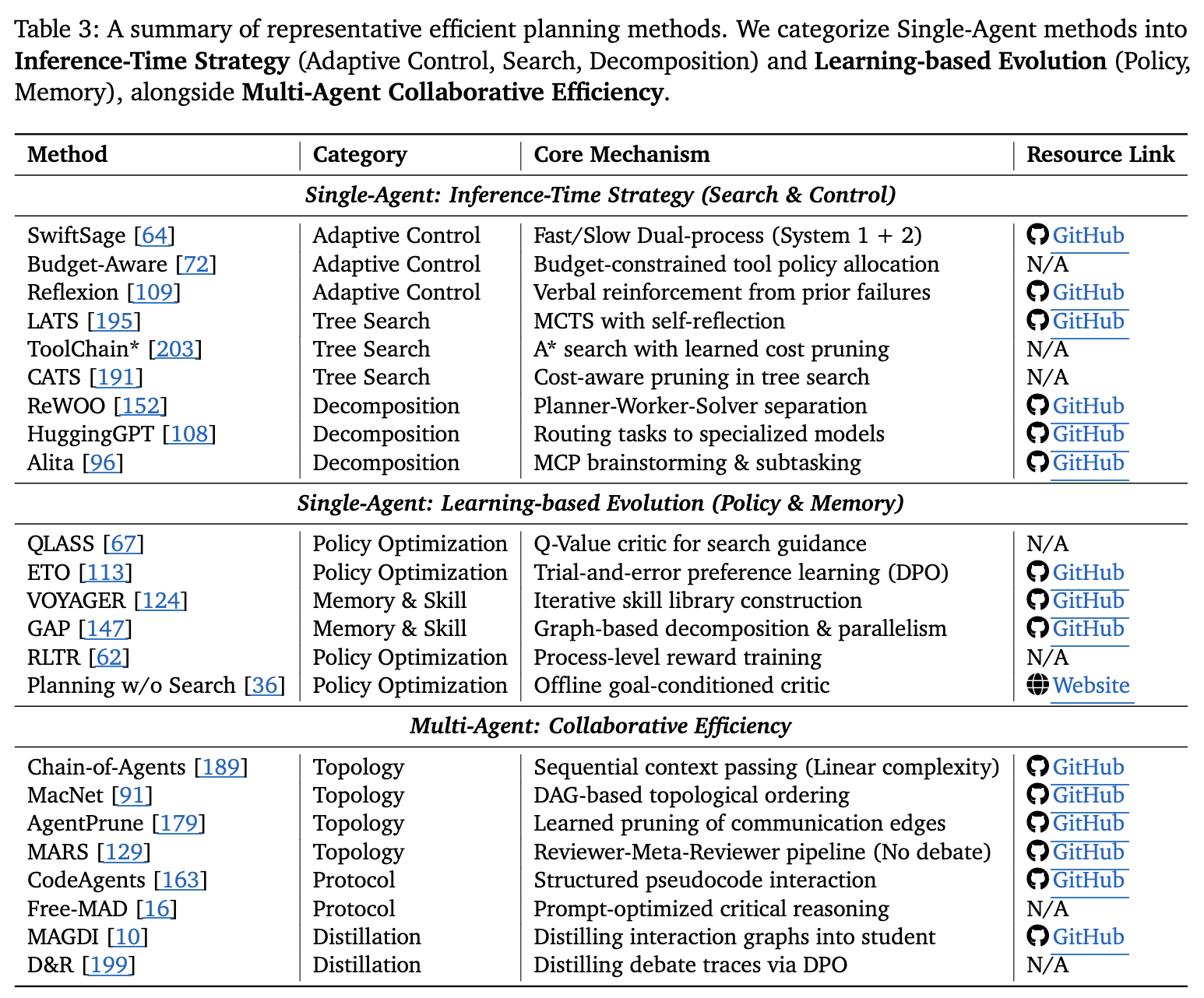 - **효율적인 계획(Efficient Planning)**은 숙고를 무한한 추론이 아닌 자원 제약 제어 문제로 프레이밍하며, 단일 에이전트 추론의 깊이(검색 및 학습을 통해)와 다중 에이전트 협업의 폭(토폴로지 및 프로토콜을 통해)을 최적화한다.