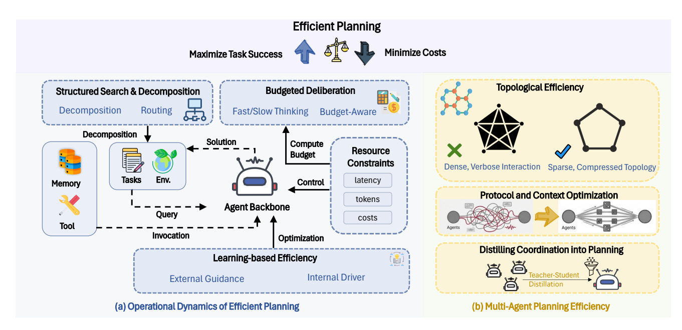 Figure 5: Overview of Efficient Planning. It aims to maximize task success while minimizing costs. (a) Single-agent methods optimize inference strategies (control, search, decomposition) or evolve via learning (policy, memory). (b) Multi-agent methods reduce overhead via topological optimization, context optimization, and coordination distillation.