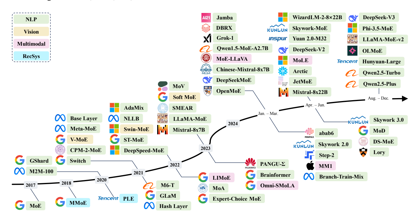Fig. 1. A chronological overview of several representative mixture-of-experts (MoE) models in recent years. The timeline is primarily structured according to the release dates of the models. MoE models located above the arrow are open-source, while those below the arrow are proprietary and closed-source. MoE models from various domains are marked with distinct colors: Natural Language Processing (NLP) in green , Computer Vision in yellow , Multimodal in pink , and Recommender Systems (RecSys) in cyan .
